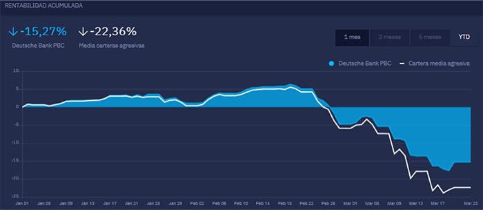Como se observa en el gráfico adjunto (fuente: Expansión), la cartera conservadora de Deutsche Bank muestra una caída del -7,4% en el año, frente a la caída del -10,8% de la media de nuestra competencia, lo que la sitúa en el puesto 2 del ranking de carteras elaborado por Expansión. En el caso de la cartera Arriesgada, la rentabilidad en el año se sitúa en el -15,3%, vs -22,3% de la media, lo que sitúa a nuestra cartera en el número 1 del ranking. En todo caso, estas cifras no ocultan un comportamiento muy negativo, consecuencia del extraordinario momento histórico en el que nos encontramos.