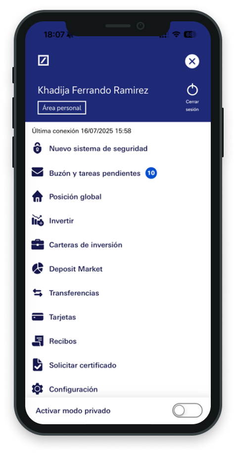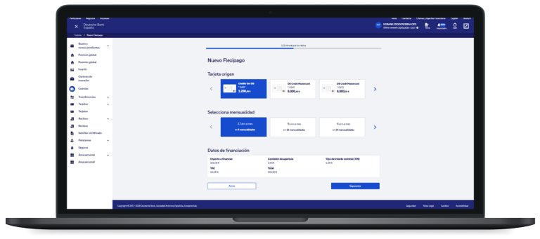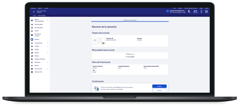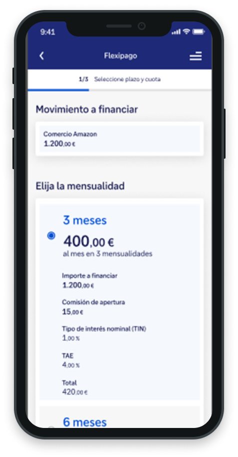 Elija “Posición global” en el menú principal de la App. Seleccione la cuenta y el cargo o movimiento que quiere financiar. Pulse en el botón “Financiar”.