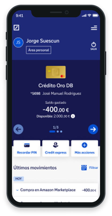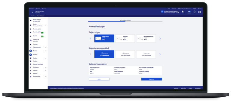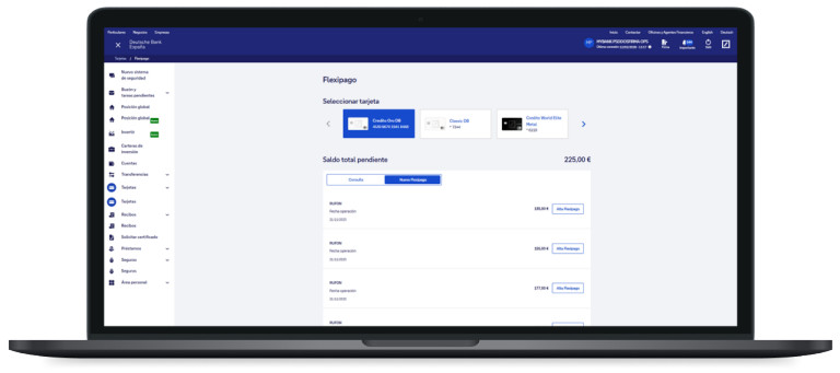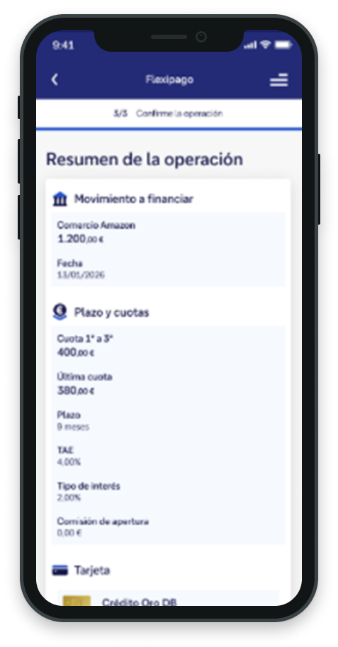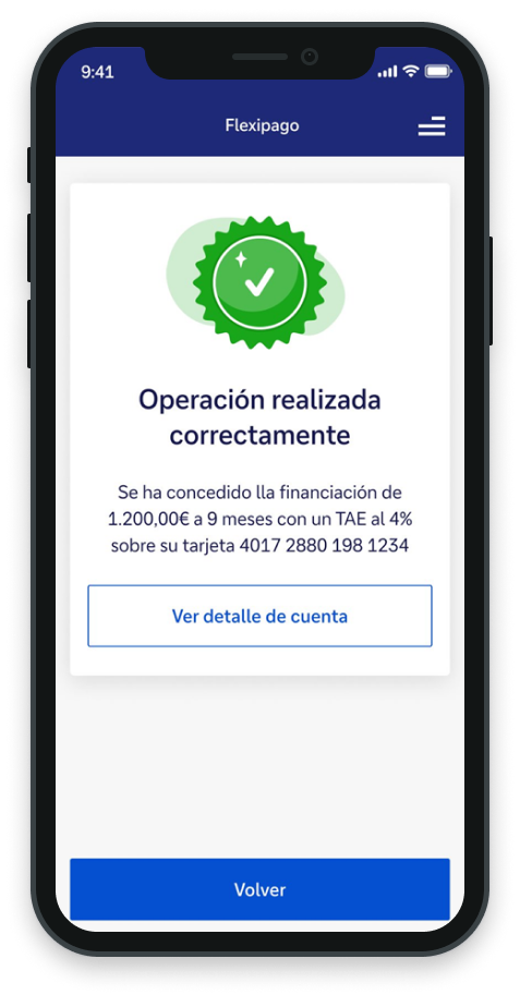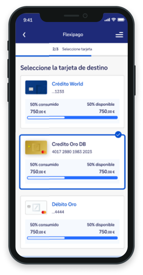 También puede acceder desde la opción “Tarjetas” seleccionando la tarjeta de crédito desde la que se ha hecho el pago. Seleccione el pago y pulse en “Financiar”.