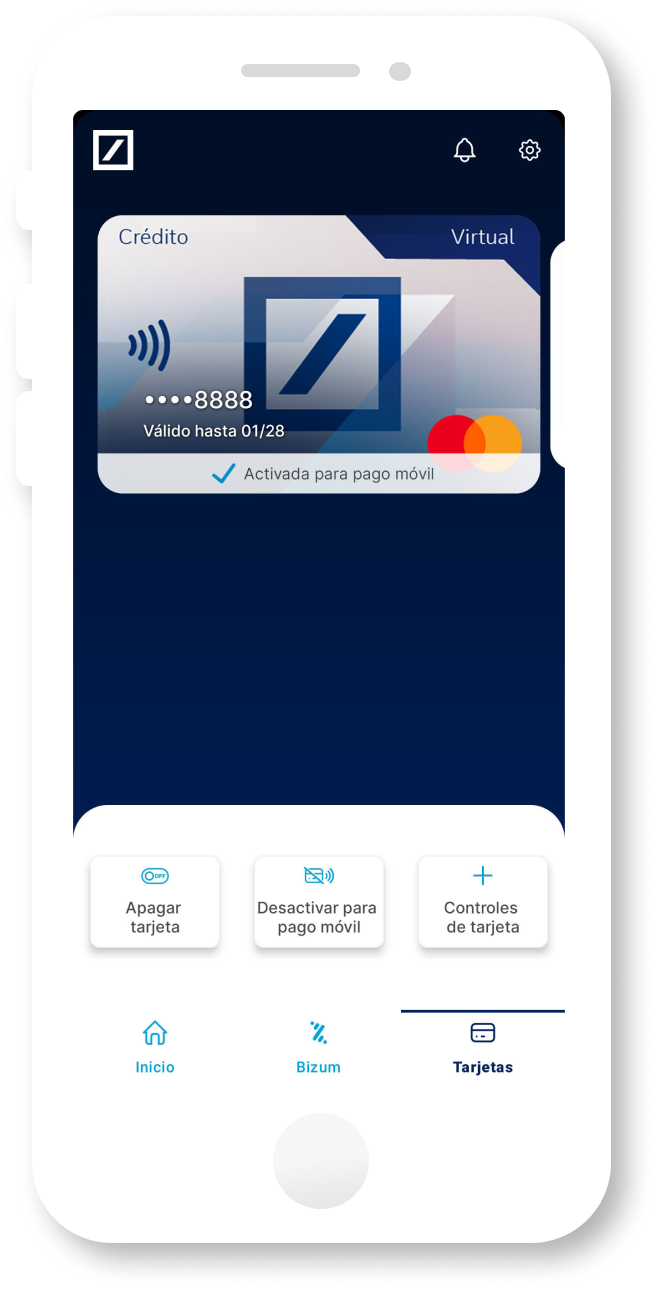 Conecte usando sus mismas credenciales que en la Banca Online y la aplicación Mi Banco DB, aceptar los términos y condiciones, y darse de alta en el servicio de Bizum y de pago en comercios (solo en Android en esta última opción). Configure la conexión con huella o rostro para conectar rápida y cómodamente.