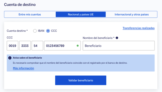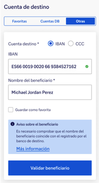 Introduzca el nombre del beneficiario y el IBAN para la transferencia que quiera emitir.