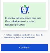 Recuerde: Indistintamente del resultado de la verificación siempre podrá seguir adelante y ordenar la transferencia. Sin embargo, tenga en cuenta que autorizar la transferencia sin haber coincidencia total de los datos del beneficiario, o sin poder verificarlo, podría resultar en que los fondos se abonen en una cuenta cuyo titular no sea el beneficiario indicado explícitamente por usted.