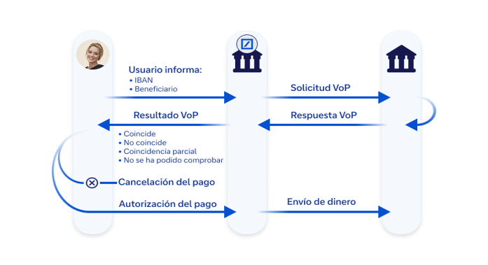 VoP es la verificación de los datos del destinatario contenidos en un pago y está destinada principalmente a contrarrestar el fraude que afecta a la ejecución inmediata e irrevocable de las transferencias en tiempo real, pero también a las transferencias clásicas de la SEPA. El EPC publicó un nuevo conjunto de reglas para el esquema VoP, que establece obligaciones, derechos y estándares para verificar el IBAN y recomendaciones para la coincidencia de nombres.